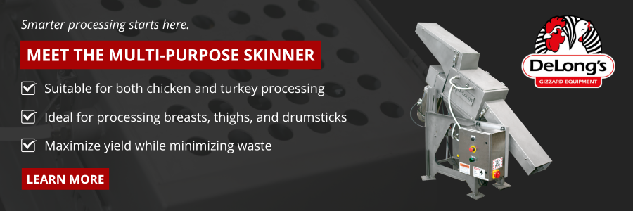 Meet your next productivity game changer: the Multi-Purpose Skinner from DeLong’s. Designed to simplify operations, it delivers high meat yield, minimal spare parts inventory, effortless maintenance, and supports both chicken and turkey processing.